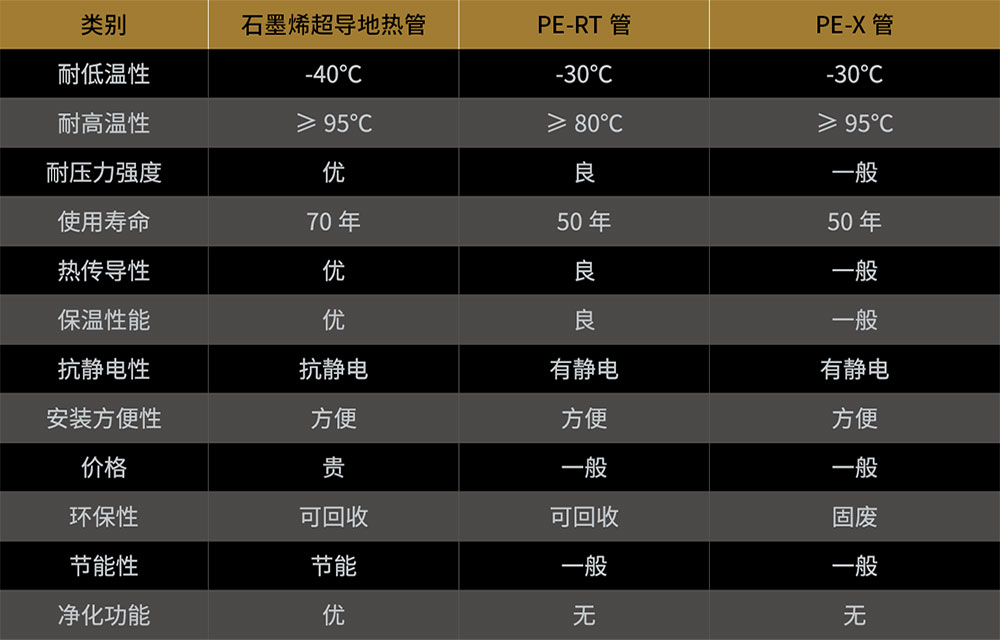 从以上数据对比可以看出,石墨烯超导地暖管与传统 PE-RT/PE-X 地暖管相比,性能有显著的提升。