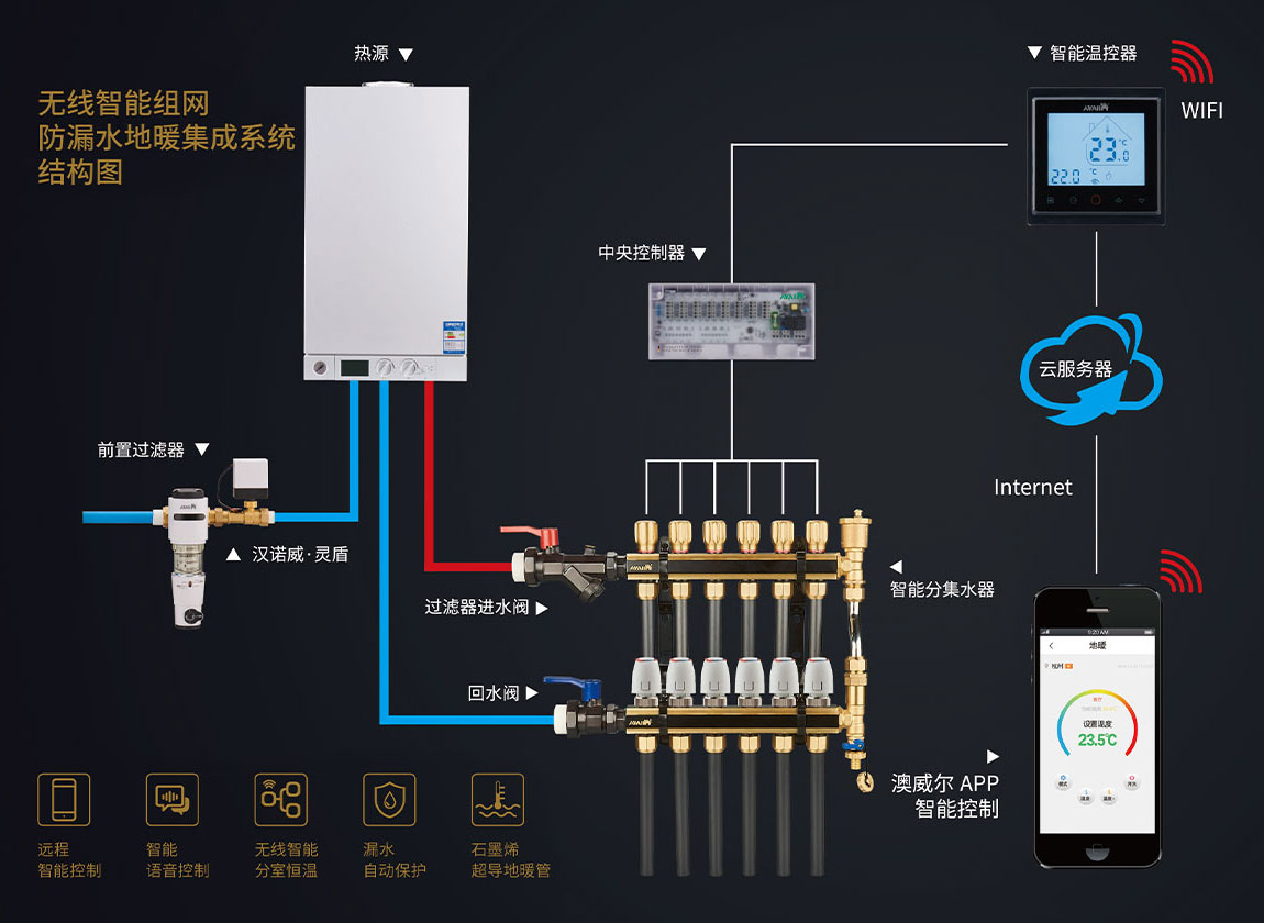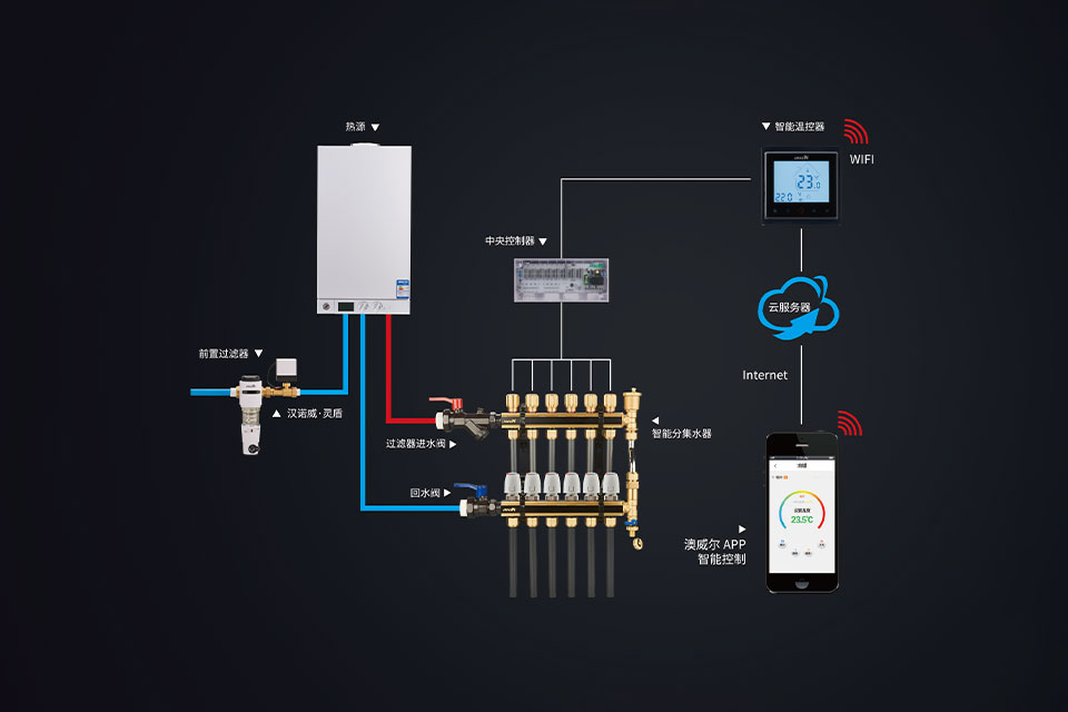 系统采用中控盒 WIFI 上网,中控盒与温控器通过无线传输,断网正常运行。室内通信穿透性强,室外远距离传输稳定,低功耗、低电压,节能。