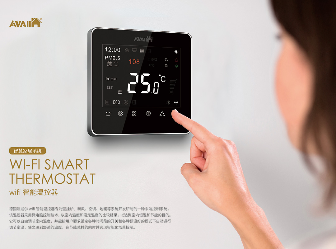 澳威尔 wifi 智能温控器专为壁挂炉、新风、空调、地暖等系统开发研制的一种末端控制系统,该温控器采用微电脑控制技术,以室内温度和设定温度的比较结果,以达到室内恒温和节能的目的。